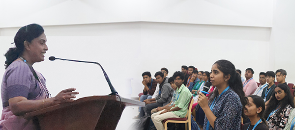 Final-year students-Ms. M. Bhavana, Mr. Affan, Ms. N. V. Chanaswi, Mr. Rohan M. Bijoy, and Mr. Hanan Mathew Suresh—shared their personal experiences, offering nuanced perspectives on the interviewer-interviewee dynamic and strategies to navigate complex interview scenarios. The session emphasized the competitiveness of aptitude assessments, providing participants with strategies to excel in these evaluations.