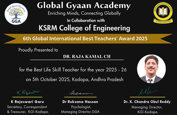 On the special occasion of World Teachers’ Day, 5th October 2025, the Academy, in collaboration with KSRM College of Engineering, proudly conferred the 6th Global International Best Teachers’ Award 2025 to Dr. Raja Kamal Ch. The award, presented at Kadapa, Andhra Pradesh, recognizes his remarkable contribution as the Best Life Skill Teacher for the year 2025–26.