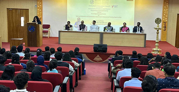 The Department of Commerce, School of Commerce, Accounting and Finance, in collaboration with the Kristu Jayanti Incubation Centre and the Entrepreneurship and Innovation Centre, organized a Knowledge Exchange Session on Start-up Incubation and Acceleration: Government Schemes and Opportunities on 28th August 2025 at 10:00 AM in the M4 Auditorium. The session was facilitated by Mr. Prabhu Gandhi Jain, a Start-up and Atal Incubation Consultant, and was attended by students of M.Com and M.Com FA (I & II Year). The objective of the program was to create awareness about incubation, acceleration, and government support systems that empower young entrepreneurs. The event began with an invocation, welcome address, and introduction of the chief guest. In his address, Mr. Jain emphasized transforming innovative ideas into viable businesses, highlighting the role of incubation centres in nurturing start-ups. He explained the journey from ideation to prototype, funding strategies, and the significance of mentorship and scaling opportunities. He further outlined government initiatives such as Atal Innovation Mission, NIDHI Schemes, and Atal New India Challenges, stressing their importance for aspiring entrepreneurs. The session was highly interactive, with students gaining clarity on incubation models, funding avenues, and the entrepreneurial ecosystem.