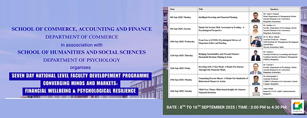 The Seven-Day National Level Virtual Faculty Development Programme on ‘Converging Minds and Markets: Financial Wellbeing & Psychological Resilience’ was organized by the School of Commerce, Accounting & Finance in collaboration with the School of Humanities & Social Sciences, from 8th to 16th September 2025. With 75 participants, the FDP featured expert sessions on intelligent investing, risk assessment, behavioral finance, sustainability, and mindful decision-making. The programme integrated insights from finance and psychology to strengthen financial literacy and resilience. The outcome highlighted innovative pedagogical approaches that empower faculty to promote holistic wellbeing in academic and research contexts.