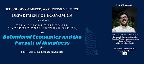 The Department of Economics- School of Commerce, Accounting and Finance organized yet another insightful session under its Talk Across Time Zones (International Lecture Series) on the 19th of September 2025. The lecture, titled “Behavioural Economics and the Pursuit of Happiness”, was designed specifically for the first and second-year M.Sc. Economics students. The event brought together academic curiosity, global perspectives, and a much-needed exploration of how economics intersects with human behaviour and well-being.