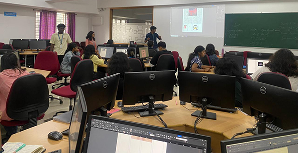 Mr Praveen explained how the master sheet could be used to bring uniformity in multi-page documents. He advised the students to be careful when choosing fonts for design. The workshop covered areas such as placing and formatting of images, paragraph styles in InDesign, applying colour themes, working with layers, package, save, export, and print files in InDesign. The workshop helped students to understand the principles of design and application in InDesign software.