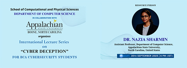 The Department of Computer Science, in collaboration with Appalachian State University, USA, organized an International Lecture Series on Cyber Deception exclusively for the BCA Cybersecurity students by Dr.Nazia Sharmin. The session aimed to provide students with valuable insights into the evolving landscape of cybersecurity, focusing on deception technologies, strategies, and their applications in safeguarding digital environments.