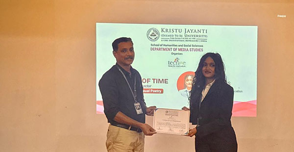 The session concluded with a formal recognition of the presenter’s efforts. Dr. Aby Augustine, Head of the Department of Media Studies, facilitated the presentation of a Certificate of Appreciation to Sneha B S, acknowledging her academic contribution. This presentation series continues to serve as a vital platform for students to engage in critical discourse and share creative expertise within the academic community.