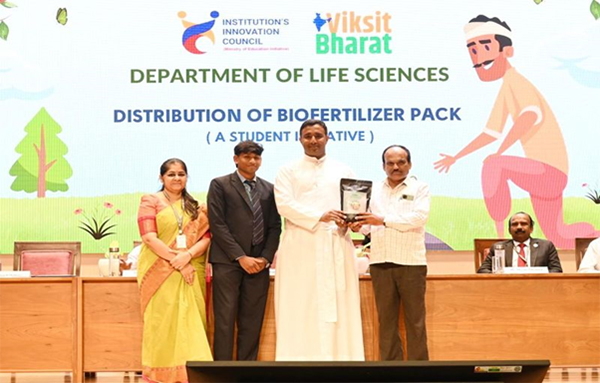 The Department of Life Sciences successfully executed an initiative “Harvest Health: Eat Local Thrive Global” during Sarva Vikas to promote local produce and support sustainable agriculture. The goal was to raise awareness about the benefits of consuming locally-grown produce, reduce the carbon footprint through farm-to-table practices, and support local farmers by removing middlemen. This initiative also provided a platform for students to engage in biopreneurship, offering hands-on experience in marketing and promoting agricultural products, such as biofertilizers. A biofertilizer cocktail, produced by second-year MSc Microbiology students, was donated to local farmers by the students. Additionally, Mr. Mithun, a second-year BSc Biotechnology & Genetics student and founder of the agri-startup 'Agri Foods', donated his bio-manure product to Mr. Basavaraj, Vice President of the Farmer’s Produce Organization, Karnataka. This collaborative effort demonstrated the department’s commitment to sustainable practices and provided students with real-world entrepreneurial experience.