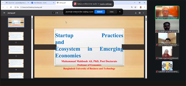The Entrepreneurship and Innovation Centre (EIC) of Kristu Jayanti Deemed to be University, Bengaluru, in collaboration with the Asian Institute of Family Managed Business (AIFMB), organized an enlightening expert talk on the topic “Startup Practices and Ecosystem in Emerging Economies” on 29th August 2025. The session was conducted in an online mode via the Zoom platform from 4:40 PM to 5:30 PM. The resource person for the session was Prof. Dr. Muhammad Mahboob Ali, a distinguished academician from the Department of Economics, Bangladesh University of Business and Technology, Bangladesh. With his vast experience in entrepreneurship, innovation, and economic development, Dr. Ali offered participants a comprehensive understanding of the dynamic startup ecosystem in emerging economies, emphasizing the opportunities, challenges, and role of innovation in fostering business growth. In his address, Dr. Ali highlighted the importance of entrepreneurship as a key driver of economic progress, especially in developing nations. He elaborated on government initiatives, funding models, and policy frameworks that encourage entrepreneurial ventures, while also emphasizing the need for collaboration between academia, industry, and government institutions to strengthen the startup ecosystem.