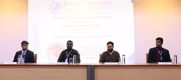 The Entrepreneurship and Innovation Centre (EIC) of Kristu Jayanti Deemed to be University, Bengaluru, in collaboration with Department of Management organized an enlightening expert talk on the topic “Unlocking Innovation: The Patent Pathway” on 26th September 2025. The session was conducted in M4 Auditorium from 3:40 PM to 4:30 PM. Mr.Swagath Parida, Senior Manager-Software Development, Dell Technologies, Bengaluru delivered an insightful expert talk on the theme “Unlocking Innovation: The Patent Pathway”. The session aimed to create awareness among students about the importance of Intellectual Property Rights (IPR) and the process of transforming innovative ideas into patents. The expert speaker highlighted that in today’s knowledge-driven economy, ideas serve as the foundation of innovation, but their true value lies in effective protection. A patent was described as a crucial tool that provides inventors with exclusive rights over their creations, prevents unauthorized use, and adds strategic value to startups. The talk emphasized that ideas alone cannot be patented; they must evolve into solutions that are novel, useful, and non-obvious. The speaker elaborated on the criteria for patentability, which include novelty, inventive step, and industrial applicability. Students were guided through the patenting process—starting from documenting the invention, conducting a prior art search, and drafting the application, to filing, examination, and eventual grant of patents. Practical insights were shared on how entrepreneurs can use patents to build competitive advantage, attract investor confidence, and generate revenue through licensing.