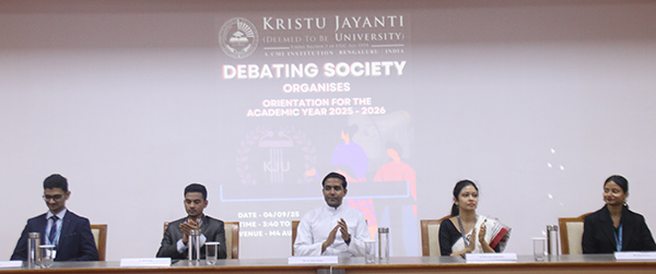 Debating Society, Kristu Jayanti (Deemed to be) University organised an orientation for the student members on 4th September, 2025 in M4 Audi from 3:40 to 4:30 pm. This session helped the new students of the club to learn about its policies and structure. Fr. Joshy Mathew CMI, Chief Human Resource Officer and the Director of Debating Society encouraged the students to contribute to the club through their active participation in the Intracollegiate debate competitions, Roundtables and Intercollegiate MUN hosted by the society. Dr. Barnashree Khasnobis and Dr. David Paul, Faculty in-charges of the society briefed on the rules and flagship events of the club. Ms. Swati Kumari (23BBNB52) and Mr. Tilak VL (23BBNA57), student secretaries elaborated on the external opportunities such as debate events, MUNs and various internal debate events are presented to the members through the club. They undertook great care in the successful completion of the orientation session.
