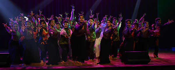 Silver Jubilee Celebrations The cultural program began right after the formal inauguration ceremony with the distinguished guests. The invocation dance by the faculties of KJDA was the first presentation. Ms. Ranjani, the faculty from Performing Arts, Ms. Sreedevi, Faculty from Media Studies Dept, Ms. Devi from the dept of Forensic Science and Dr Nishitha from the dept of English were part of this presentation. The dancers offered flowers on stage and welcomed the gathering. The second dance was a confluence of different Indian classical dances, presented by the students of Kristu Jayanti Dance Academy. The dancers brought on stage the authentic dance styles such as Bharatanatyam, Kuchipudi, Mohiniattam, kathak and Satthriya. Total 19 students were part of this presentation. The thematic Eastern Dance was presented immediately after the classical extravaganza and 16 students participated in this. The highlight of the program was the presentation of Bamboo Dance of Mizoram. Total 16 students from Mizoram presented their traditional dance form on stage. The final presentation was Kamsale, a folk dance form of Karnataka. The students were given the training for learning this folk dance form prior to the show. There were 18 participants in this presentation, out of which 4 artists were the accompanists and the remaining were dancers.