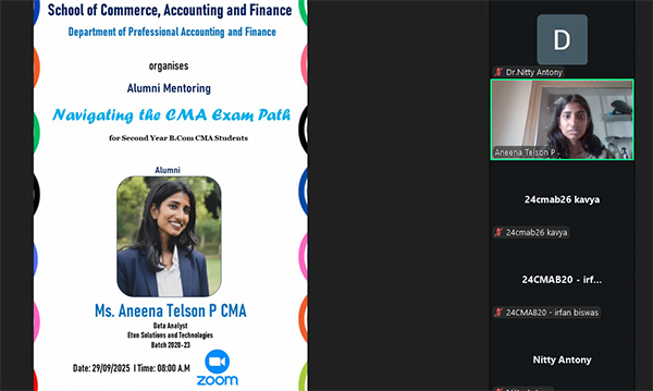 The Alumni Mentoring Session was held on 29th September 2025, from 8:00 to 8:50 AM through online mode for second year B. Com with CMA students. Ms. Aneena Telson P from Batch 2020-23, currently working as a Data Analyst at Eton Solutions and Technologies, conducted an insightful session focused on the significance of the CMA certification. She elaborated on effective preparation strategies and highlighted various career opportunities available to CMA professionals. Ms. Aneena also took time to address individual queries, providing personalized guidance to participants. The session was well-received and proved valuable in motivating and guiding students towards their professional goals. Overall, it was an engaging and informative session that enriched the participant’s understanding of CMA.