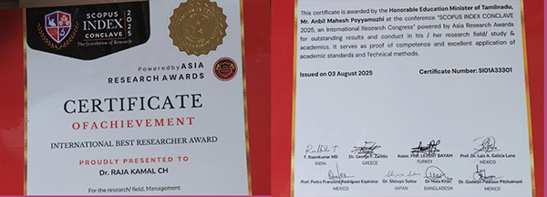 Dr. Raja Kamal Ch from the Department of Professional Management Studies, School of Business and Management), humbled to share that I have been honored with the International Best Researcher Award at the SCOPUS Index Conclave 2025. The Foundation of Research. The award was presented under the category of Management Research, recognizing my contributions and research excellence. The award was conferred by the Honorable Education Minister of Tamil Nadu, Mr. Anbil Mahesh Poyyamozhi, during the International Research Congress powered by Asia Research Awards. This recognition stands as a testimony to our institution’s commitment to research excellence and academic standards.
