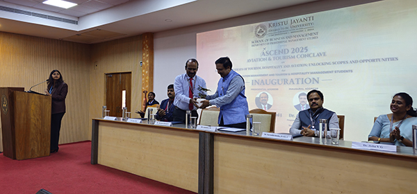 The Department of Professional Management Studies successfully organized ASCEND 2025 – Aviation and Tourism Conclave, addressing to the theme “Navigating the Pathways of Tourism Hospitality and Aviation: Unlocking scopes and Opportunities “. This interactive platform designed to bridge academic learning with industry expertise in the fields of aviation, tourism and hospitality organized on 30th September 2025 to commemorate World Tourism Day 2025. The conclave witnessed enthusiastic participation, benefitting a total of 250 participants, including aviation management & tourism and hospitality management students. The conclave was inaugurated by Dr. Ananda C. M., Program Director – Civil Aircrafts, Professor at ACSIR, Chief Scientist and Head of Aerospace Electronics & System Division, National Aerospace Laboratory. As the Chief Guest, Dr. Ananda addressed the gathering with an inspiring keynote on emerging technologies in civil aviation and the pivotal role of aerospace research in advancing global connectivity. His thought-provoking insights set a strong foundation for the sessions that followed.