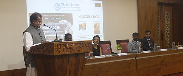 The Department of Economics, School of Commerce, Accounting and Finance, Kristu Jayanti (Deemed to be University), inaugurated ECONOMIA 2025, its intrauniversity fest, on 9th September 2025 at the H2 Auditorium, Humanities Block. The fest, themed “Leveraging AI to Shape the Economy”, was exclusively designed for undergraduate economics students to foster intellectual growth and creativity. Fr. Dr. Augustine George, Vice Chancellor, delivered the presidential address, highlighting the importance of academic initiatives in preparing students to become future leaders and innovators. The inaugural address was delivered by Dr. Smrite Goudhaman, Pre-Sales Solution Leader, Datamatics, Bengaluru, who emphasized the growing role of Artificial Intelligence in all spheres of life and urged students to embrace emerging technological opportunities. Her address inspired participants to think critically about how AI can reshape economies and societies. The festival featured four major competitive events, attended by 123 students: Economic Policy Formation, Debate, Just A Minute (JAM), and Quiz—each designed to enhance students’ analytical, communication, and problem-solving skills. The Economic Policy Formation event allowed students to design innovative policies to tackle contemporary challenges, while the Debate encouraged logical reasoning and the articulation of diverse perspectives. JAM tested spontaneity and quick thinking, whereas the Quiz assessed knowledge of economics, AI, and current affairs. Each event saw enthusiastic participation, reflecting the energy and intellectual curiosity of the student community. The fest provided a vibrant platform for applying classroom knowledge in practical and engaging ways. ECONOMIA 2025 successfully combined academic rigor with creativity, leaving students motivated to explore the future of economics in an AI-driven world.