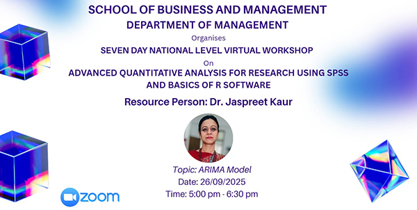 The Department of Management, School of Business and Management, Kristu Jayanti (Deemed to be) University, organized a Seven Day National Level Virtual Workshop on Advanced Quantitative Analysis for Research using SPSS and Basics of R Software from 22nd to 29th September 2025. The workshop aimed to enhance participants’ research competencies by providing advanced knowledge in quantitative data analysis using SPSS and introducing the foundational concepts of R software for research applications.
