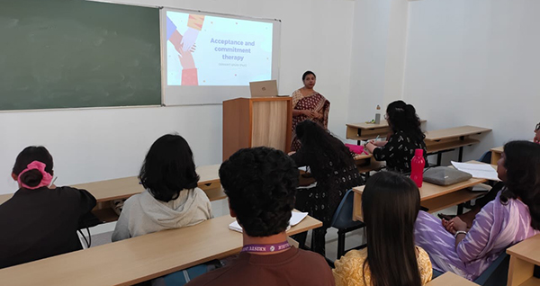 The Department of Psychology at Kristu Jayanti (Deemed to be University) organised a guest lecture on “Recent Trends in Therapy” on 23rd October 2025-24th October 2025 in the Humanities block H606, exclusively for III Semester M.Sc. Psychology (Clinical specialization) students. Approximately eleven students from the M.Sc. Psychology (Clinical specialization) attended the sessions. The session was addressed by Dr Debarati Basak, PsyD, Founding Partner, Carpediem EdPsych Consultancy LLP, Bengaluru, Karnataka, India. The session on Recent Trends in Therapy was highly enriching and insightful. Theoretical concepts were effectively supplemented with interactive activities and case discussions, fostering a deeper understanding of various contemporary therapeutic approaches. In addition to an in-depth discussion on Dialectical Behaviour Therapy (DBT), the session also covered Acceptance and Commitment Therapy (ACT), Cognitive and Analytical Therapy, Interpersonal and Social Rhythm Therapy, Solution-Focused Brief Therapy (SFBT), and Eye Movement Desensitisation and Reprocessing (EMDR). The expert shared personal experiences and case examples from her private practice, which added practical depth to the learning experience. Students listened attentively and participated enthusiastically, making the session highly engaging and informative.