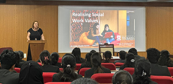 Dr. Kelly Glubb Smith emphasized the fundamental values that guide social work practice, including empathy, integrity, respect for human dignity, and social justice. She discussed the role of ethics in addressing complex social issues and ensuring professional accountability. The session covered various fields within social work, such as mental health, child welfare, community development, healthcare, and advocacy. Dr. Smith provided insights into international best practices, highlighting the importance of cultural competence and evidence-based interventions. She also showed a video of University of Waikato to the students.