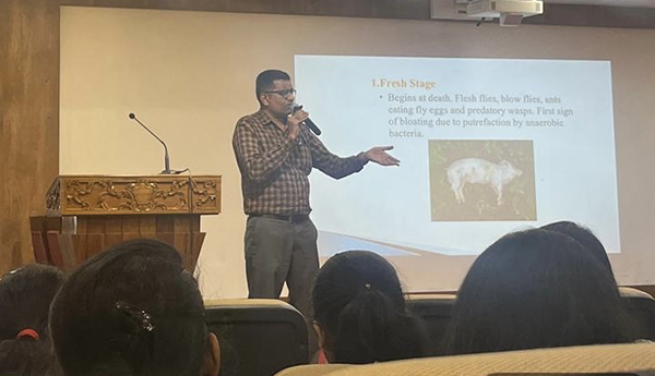 He emphasized the scientific importance of understanding insect life cycles, habitat preferences, and succession patterns in relation to the stages of human decomposition. The lecture also shed light on the role of forensic entomology in uncovering hidden evidence, such as detecting drug or poison residues within insect specimens. In addition, Dr. Shashikumar introduced students to the latest advancements and research trends in this field, emphasizing its growing significance in strengthening court trials and aiding justice delivery.