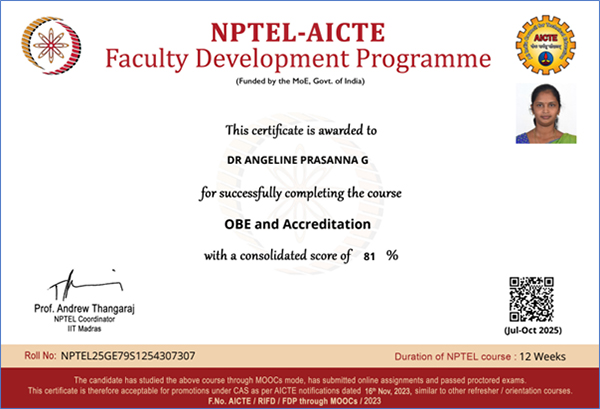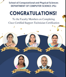 Faculty members have successfully completed the Cisco Certified Support Technician (CCST) Certification and Microsoft Azure Fundamentals certification. In addition, they have accomplished multiple NPTEL courses with high performance standards. These certifications reflect the faculty’s commitment to continuous professional development. The achievements enhance expertise in emerging technologies and cloud computing. Such accomplishments strengthen academic quality and industry relevance of the institution.