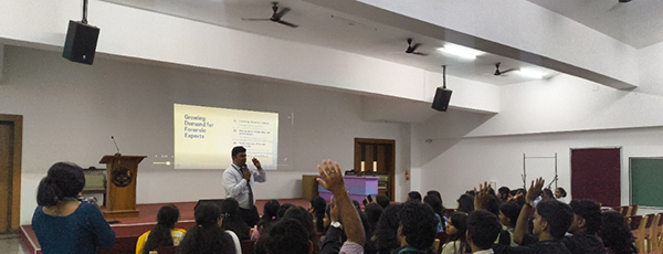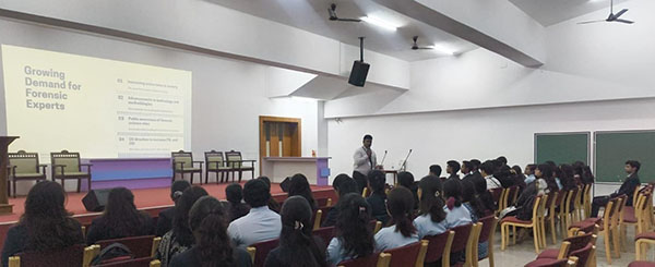 During the session, Mr. Caeiro emphasised the importance of bridging the gap between theoretical knowledge and real-world application. He highlighted emerging domains within forensic science such as digital forensics, forensic toxicology, forensic DNA analysis, cyber forensics, and crime scene investigation, encouraging students to identify their areas of interest early and work consistently towards specialization. He also discussed the growing demand for forensic experts in government laboratories, private forensic consultancies, law enforcement agencies, research institutions, and academic sectors. A significant portion of the talk focused on skill enhancement and professional preparedness. Students were advised to cultivate critical thinking, analytical reasoning, report writing proficiency, and courtroom presentation skills. The resource person stressed the value of internships, research projects, certifications, and participation in workshops and conferences to build a strong professional profile. He also provided insights into higher education opportunities, competitive examinations, and international prospects in forensic science.
