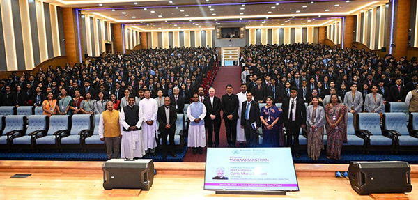 The 53rd Vichaarmanthan was organised on Thursday, January 8, 2026, by the Department of Life Sciences, Kristu Jayanti (Deemed to be University). This prestigious forum aims to foster meaningful engagement with eminent Indian and international visionaries, thereby broadening academic perspectives and nurturing informed leadership. The event gained special significance as the University had the honour of hosting His Excellency, Archbishop Rev. Fr. Carlo Maria Polvani, Secretary of the Dicastery for Culture and Education, Rome, Italy, for the first time. His Excellency was accompanied by the Most Rev. Fr. Hrudaya Raju, Official of the Dicastery for Asia and Oceania and Rev. Fr. Mathew Attumkal, President of Dharmaram Vidya Kshetram. In his address, Archbishop Polvani recalled his research on the sodium–potassium pump and the experimental limitations of earlier scientific methods. Comparing past and present technologies, he noted the advancements enabled by artificial intelligence. He highlighted the transformative impact of AI on Chemistry and related disciplines. Emphasizing ethical responsibility, he urged students to ensure scientific progress benefits humanity. He concluded by inspiring students to pursue excellence and extraordinary success. The forum was subsequently opened for interaction, during which His Excellency, Archbishop Rev. Fr. Carlo Maria Polvani, engaged in a fruitful and insightful discussion with the students, addressing their queries and inspiring them with his profound perspectives.