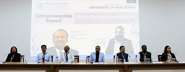 The Department of Management, Kristu Jayanti University, with great pride and academic commitment, organized its prestigious Signature Event – Entrepreneurship Series, envisioned to ignite and nurture the entrepreneurial spirit among young and aspiring minds. The series was meticulously designed to create a transformative learning environment, aimed at equipping students with the critical competencies, innovative thinking, and leadership qualities essential for entrepreneurial success in today’s dynamic business landscape. The five-day Entrepreneurship Summit, conducted from 9th to 13th February, stood as a celebration of innovation, enterprise, and experiential learning. Each day of the programme was thoughtfully structured to inspire, engage, and empower students through meaningful interactions with accomplished entrepreneurs, industry experts, and emerging student leaders. The series commenced on Day One with a formal and dignified Inauguration Ceremony, marking the beginning of an intellectually enriching journey. This was followed by a keynote entrepreneurial address by Dr. Nishant Jayant, Fondur & Director - Peritum Productions and Events Pvt.Ltd whose insightful deliberations on innovation, leadership, and entrepreneurial vision set an inspiring tone for the entire series.