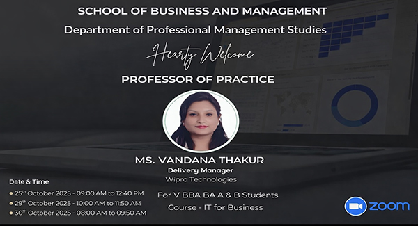 Ms. Vandana Thakur, Professor of Practice (PoP), currently serving as a Delivery Manager at Wipro Technologies, conducted a series of online academic sessions through the ZOOM platform as part of the curriculum enrichment initiative. With over 17 years of extensive industry experience across multiple professional roles, Ms. Thakur brought strong practical and industry-oriented perspectives to the learning process, effectively bridging the gap between classroom theory and real-world business applications. There were two classes involved -Business Analytics A & B sections.