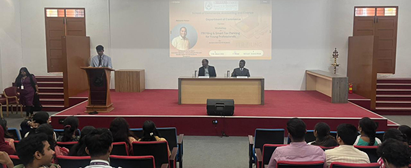 The Department of Commerce (PG), Kristu Jayanti Deemed to be University, Bengaluru, organized a workshop on “ITR Filing & Smart Tax Planning for Young Professionals” on 11th March 2026 for the students of M.Com and M.Com (FA) to enhance their awareness of tax compliance and financial planning. The session was delivered by CA. Suresh Kumar Mani, Executive Director – Accounting, CSG Systems, Bengaluru, who shared valuable insights into the practical aspects of Income Tax Return (ITR) filing, tax deductions, and effective financial planning for young professionals. Through practical examples and real-world experiences, the resource person highlighted the importance of responsible tax compliance and informed financial decision-making. The workshop was conducted under the guidance of Dr. Cherian Thomas, Coordinator, and organized by Dr. Pushpa and Dr. Mohan Kumar R., Event Coordinators, with the support of faculty members. The interactive session proved to be highly informative and beneficial for the participating students.