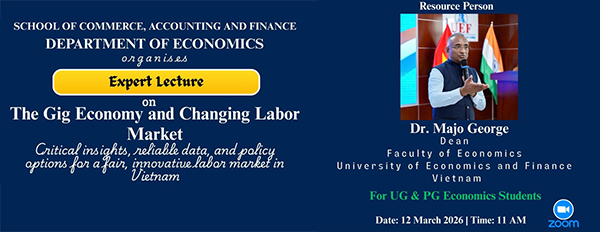 The Department of Economics at Kristu Jayanti College organised an expert lecture on “The Gig Economy and Changing Labour Market” on 12 March 2026 via Zoom. The session was delivered by Dr Majo George, who shared critical insights on emerging labour market trends and gig-based employment structures. All UG and PG Economics students actively attended the programme, reflecting strong academic interest in contemporary economic issues. The speaker highlighted the growth of platform-based work, its implications for job security, and the evolving nature of employer-employee relationships. He also discussed reliable data sources and policy options to ensure fairness and innovation in the labour market, with special reference to Vietnam. The lecture encouraged students to think critically about globalisation, digitalisation, and their impact on employment patterns. The session concluded with an interactive discussion, making it an enriching learning experience for all participants.