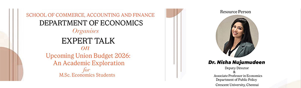 The Department of Economics, School of Commerce, Accounting, and Finance, Kristu Jayanti (Deemed to be University), Bengaluru, successfully organised an Expert Talk on “Upcoming Union Budget 2026: An Academic Exploration” on January 30, 2026, at 11:00 AM for M.Sc. Economics students(60 students). The session was delivered by Dr. Nisha Nujumudeen, Deputy Director and Associate Professor of Economics in the Department of Public Policy at Crescent University, Chennai. The objective of the programme was to provide students with an academic and policy-oriented understanding of the Union Budget, focusing on its macroeconomic framework, fiscal priorities, and sectoral implications. Dr. Nujumudeen offered an insightful analysis of the expectations surrounding the Union Budget 2026, highlighting key aspects such as fiscal consolidation, public expenditure patterns, taxation reforms, social sector allocations, and growth-oriented policy measures. She also discussed the role of the budget in addressing contemporary economic challenges, including inflation management, employment generation, and sustainable development. The session effectively linked theoretical concepts taught in the classroom with real-world fiscal policymaking. The programme was interactive, with students actively participating in the discussion and raising questions related to budgetary priorities, public finance, and policy trade-offs. The expert clarified doubts and encouraged critical thinking among students, thereby enhancing their analytical and applied understanding of economic policy. The expert talk was highly informative and academically enriching. It helped students gain deeper insights into the Union Budget as a vital policy instrument and strengthened their ability to critically evaluate fiscal decisions. The Department of Economics expresses its sincere gratitude to Dr. Nisha Nujumudeen for her valuable contribution and to all participants for making the event a success.