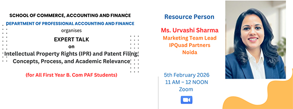The Department of Professional Accounting and Finance, Kristu Jayanti (Deemed to be University), Bengaluru, organized an Expert Talk on “Intellectual Property Rights (IPR) and Patent Filing: Concepts, Process, and Academic Relevance” for all First Year B. Com PAF students. The resource person, Ms. Urvashi Sharma, Marketing Team Lead at IPQuad Partners, Noida shared practical insights into various forms of intellectual property, procedures involved in patent filing, documentation requirements, and the growing relevance of patents in innovation-driven industries and academic research.
