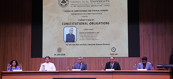 An Expert Talk on Constitutional Obligations was organized on 24/01/2026 for I Year BCA and B.Sc. Computer Science students as part of the Universal Human Values and Professional Ethics initiatives of the institution. The session was delivered by Justice Subhash B. Adi, Former Judge, High Court of Karnataka, Former Upalokayuktha and Chairman (NGT) – State Level Monitoring Committee for Solid Waste Management.
