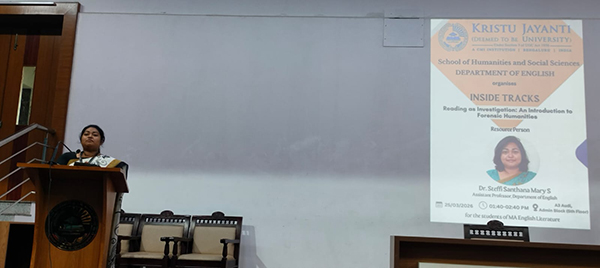 The Department of English organised an expert session under the Inside Tracks series titled “Reading as Investigation: An Introduction to Forensic Humanities” on 25 March 2026 from 1:40 PM to 2:40 PM at A3 Audi, Admin Block (5th Floor).The session was delivered by Dr. Steffi Santhana Mary S., Assistant Professor, Department of English. It was conducted for the students of MA English Literature with the objective of introducing them to the interdisciplinary field of forensic humanities and its relevance in literary studies. The resource person explored how methods of investigation, evidence analysis, and critical interpretation can be applied to literary texts. The session highlighted how reading can function as a form of inquiry, encouraging students to approach texts with analytical precision and investigative curiosity. Key concepts related to textual analysis, interpretation of narrative clues, and the intersection of literature with forensic thinking were discussed.