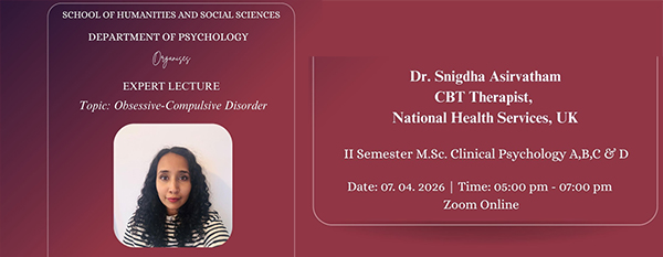 The Department of Psychology, School of Humanities and Social Sciences, Kristu Jayanti (Deemed to be University), Bengaluru, organised an expert lecture on the topic “Obsessive-Compulsive Disorder” on 7th April 2026 from 5:00 PM to 7:00 PM via Zoom.