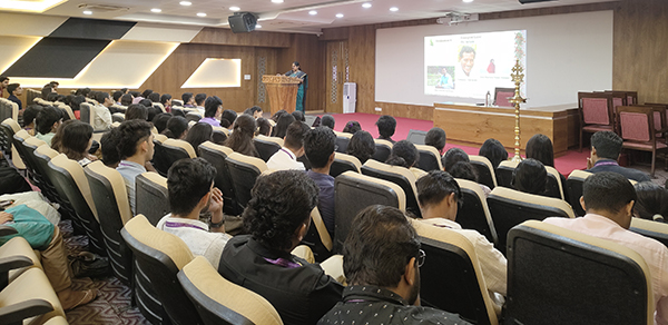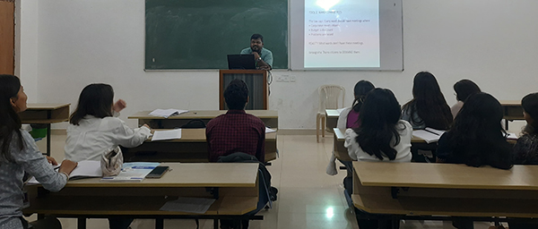 The session commenced with a warm welcome and introduction of the guest speaker. Shri Santhosh Rao began the lecture by highlighting the contemporary challenges and opportunities in the field of Human Resources, emphasizing the growing role of HR in organizational success. His engaging style and practical approach immediately created an interactive atmosphere, encouraging students to reflect on their career aspirations.