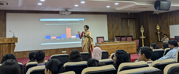 During the session, Dr. Lyola Thomas emphasized the shift from compartmentalizing life roles to integrating personal, academic, and professional responsibilities holistically. To make the discussion experiential, she conducted a brief mentor–mentee survey that helped students identify the key areas of their lives most affected during periods of stress. The findings opened space for reflection and dialogue, enabling participants to recognize common stressors and patterns influencing their emotional and academic well-being.