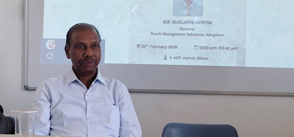 The resource person Mr. Mailappa Gowda, Director, Reach Management Solutions, Bangalore, brought extensive industry experience and practical insights into the field of human resource management. The lecture focused on the concept, scope, and significance of industrial relations in maintaining harmonious relationships between employers and employees. Mr. Gowda elaborated on the role of trade unions, collective bargaining, grievance redressal mechanisms, and labour legislations in fostering workplace stability and productivity.