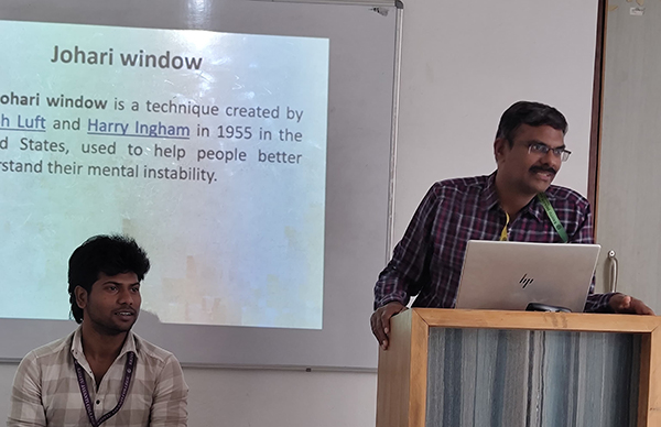During the session, Dr. T.Babu discussed key concepts of organizational behaviour, particularly focusing on the Johari Window, Transactional Analysis, and Group Dynamics. He explained how the Johari Window model helps individuals develop self-awareness and understand interpersonal relationships within teams. The concept of Transactional Analysis was elaborated through the Parent, Adult, and Child ego states, highlighting how communication styles influence interactions in workplace settings. He also emphasized the importance of group dynamics in promoting teamwork, cooperation, leadership, and effective collaboration in organizational environments.