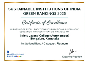 Kristu Jayanti College (Autonomous), Bengaluru, has been recognized under the Sustainable Institutions of India – Green Rankings 2025 and awarded the Certificate of Excellence in the Platinum Institutional Band. This recognition highlights the institution’s strong commitment to sustainable education, environmental stewardship, and responsible campus management. The ranking acknowledges the university’s efforts in implementing green initiatives such as energy conservation, water management, waste management, and biodiversity conservation across the campus. Through active participation of management, faculty, and students, the institution continues to promote eco-friendly practices and sustainability-driven policies. The Platinum category recognition reflects the institution’s continuous efforts to integrate sustainability into academic, operational, and community engagement activities.