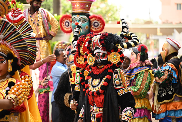 The campus came alive with three live DJs set up across different spots, turning the day into a vibrant mix of music and energy. Traditional tunes blended effortlessly with modern beats, and soon, no one could resist moving to the rhythm. The whole atmosphere was electric; everywhere you turned, students were dancing and singing. Adding to the magic, folk dance forms of Karnataka like Hulivesha and Gombe Aata were beautifully performed, bringing a splash of tradition to the celebration. Professional artists joined in to showcase these folk forms, giving everyone a glimpse of Karnataka’s rich and colourful heritage. With over 16,000 students gathered on campus, the energy was beyond words. The decorations transformed the entire university into a living celebration, with colorful drapes, traditional art installations, and lights that reflected the diversity of our heritage.