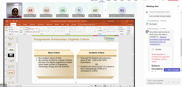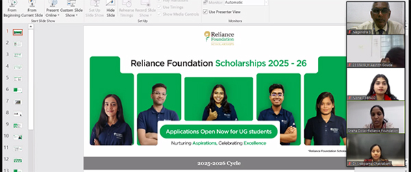 Reliance Foundation UG and PG Scholarship session is organizing orientation session on 25th August 2025 from 11 AM to 12 NOON in Microsoft meeting. The session was attended by the various institution representatives across India. The resource persons highlighted the eligibility criteria including basic and academic criteria for applying UG and PG Scholarships. The session also highlighted the application and selection process. Lot of inputs has given to the representatives to encourage students to apply for the scholarship. This orientation sets the stage for a fulfilling and impactful journey with the Reliance Foundation.