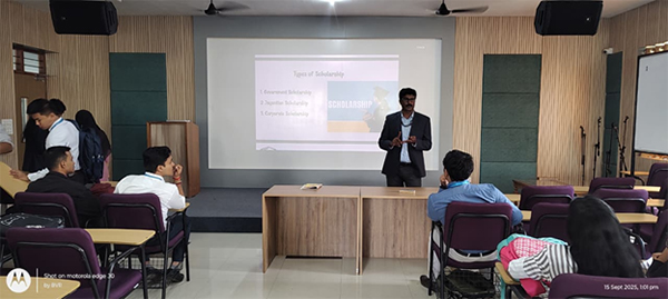 School of Business and Management organized orientation on Various Scholarship available across India. Mr. Manjunath S, Faculty has a rich experience in the field of Scholarship explained about the various Private and Government scholarships. He stressed how important is to apply various scholarships and also narrated how few students successfully got the scholarship last year. Overall it was an interactive session and Resource person answered all the questions raised by the students.