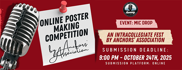 The Anchors’ Association organized an online Poster Making Competition on 24th October 2025, centered on the theme “Mic Drop – An Intercollegiate Fest.” The event invited participants to design posters that visually represented the essence of anchoring, performance, and communication.