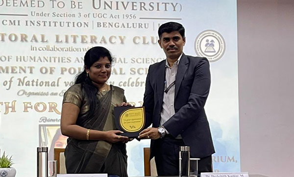 The Electoral Literacy Club, in collaboration with the Department of Political Science, organised an expert talk titled “Youth for Democracy” as part of the National Voters’ Day Celebrations 2026 on 28 January 2026 at the M4 Auditorium. Dr. Chaitra C, the resource person for the event, effectively highlighted recent electoral reforms introduced by the Election Commission of India, including technological advancements, administrative improvements, and measures aimed at enhancing transparency and efficiency in the electoral process. The session also provided clear insights into electoral expenditure limits and institutional mechanisms such as ECINet.