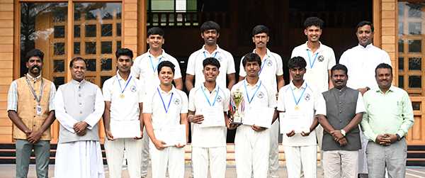 The Men’s Cricket Team of Kristu Jayanti (Deemed to be University) delivered an exceptional display of skill, teamwork, and perseverance at E-SPIRIT 2025, the Intercollegiate Sports Fest hosted by Azim Premji University, Bengaluru, from October 17 to 19, 2025. The 18-member squad exhibited consistent excellence throughout the tournament and secured the Championship title, reflecting their unwavering commitment, discipline, and sportsmanship. In recognition of this outstanding accomplishment, the University Management, led by Rev. Fr. Dr. Augustine George, Vice Chancellor, and Rev. Fr. Dr. Lijo P. Thomas, Pro-Vice Chancellor, conveyed their warm congratulations and appreciation to the triumphant team. The felicitation ceremony was joined by Prof. Arockiaraj, Director of Physical Education, and Lt. Manivannan S., Physical Education Instructors, who lauded the players for their exemplary performance and dedication. The University also extended special acknowledgment to Dr. Riyas Pasha, Head Coach of Cricket, for their committed mentorship and tactical guidance, which played a significant role in steering the team to this prestigious victory.