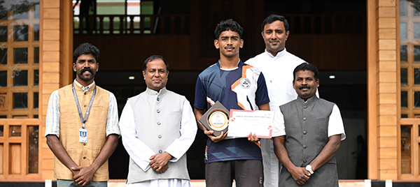 Kushal Yadav, a student of BBA Aviation Management and a key member of the Throwball Team of Kristu Jayanti (Deemed to be University), exhibited exceptional skill, consistency, and sportsmanship at INFINI 2025 – the National Level Sports Fest organized by PES University, Bengaluru, from October 13 to 17, 2025. Demonstrating remarkable performance throughout the tournament, Kushal was honoured with the Best Player Award, reflecting his dedication, discipline, and exemplary athletic spirit. In recognition of this outstanding achievement, the University Management, led by Rev. Fr. Dr. Augustine George, Vice Chancellor, and Rev. Fr. Dr. Lijo P. Thomas, Pro-Vice Chancellor, extended their warm congratulations and appreciation to the team. The felicitation ceremony was graced by Prof. Arockiaraj, Director of Physical Education, and Lt. Manivannan S., Physical Education Instructors, who commended the athletes for their remarkable efforts. Special recognition was also given to Mr. Sharan, Head Coach of Throwball, and Mr. Rajkumar, Assistant Coach, for their dedicated mentorship and strategic guidance that significantly contributed to the team’s success.